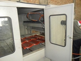 2、Auto sand blast house:1set Out size:3000(L)×1850(W)×700(H)mm Structure:Channel steel, connected by weld Drive power:same with item 1. Transporter:by circle chains Auto sand funnel:1set 550(L)×600(W)×500(H)mm Auto rising equipment:1set, can rise 1.9m, Blasting gun:4 sets |
